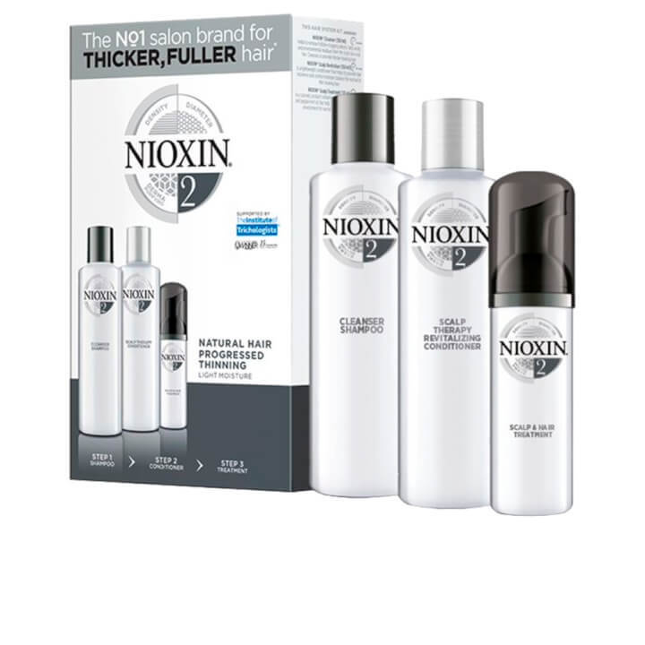 El kit Nioxin Hair Care System 2 para cabello natural con adelgazamiento progresivo amplifica la estructura del cabello y protege contra la rotura del cabello